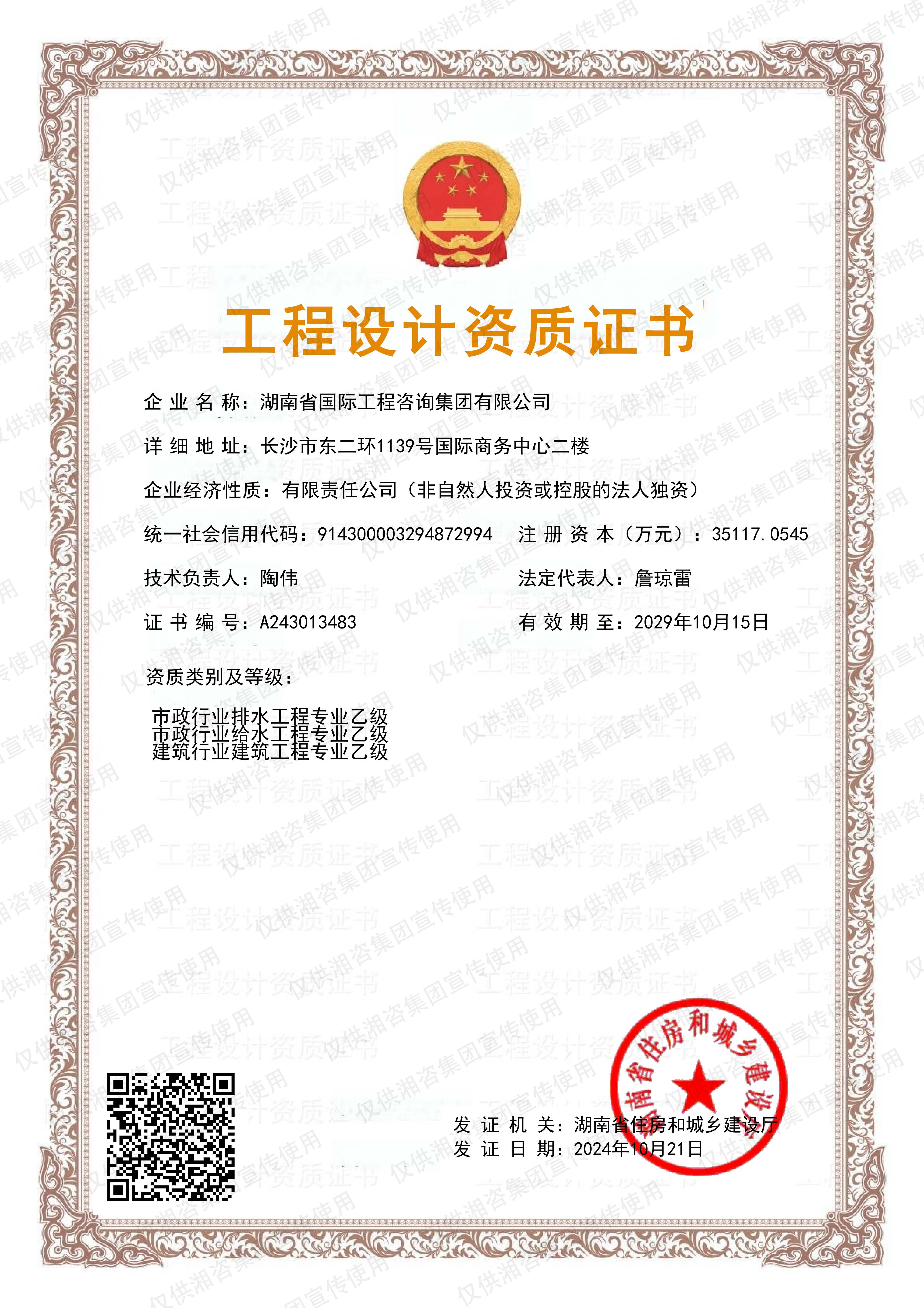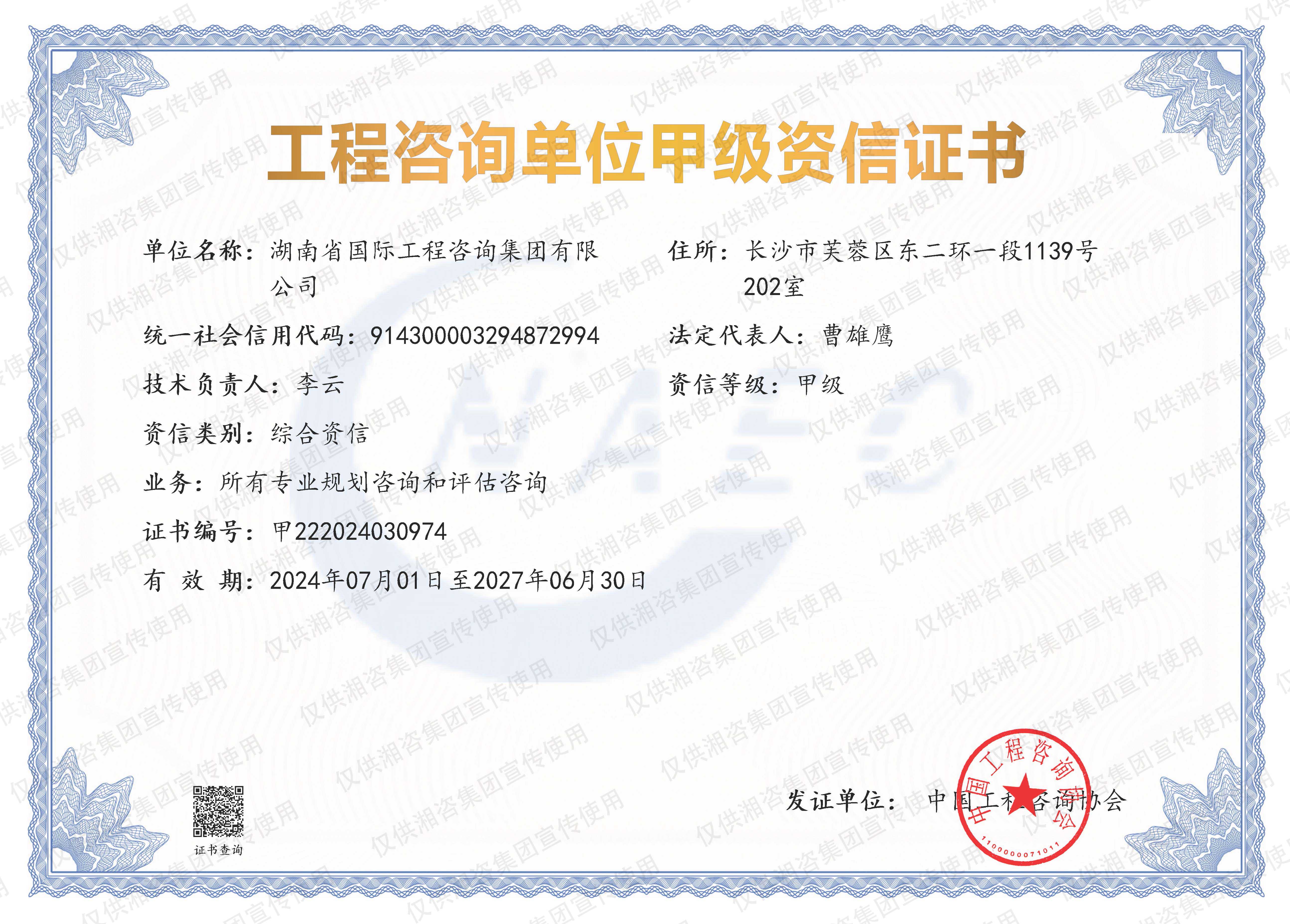 工程咨詢單位甲級資信證書-甲級