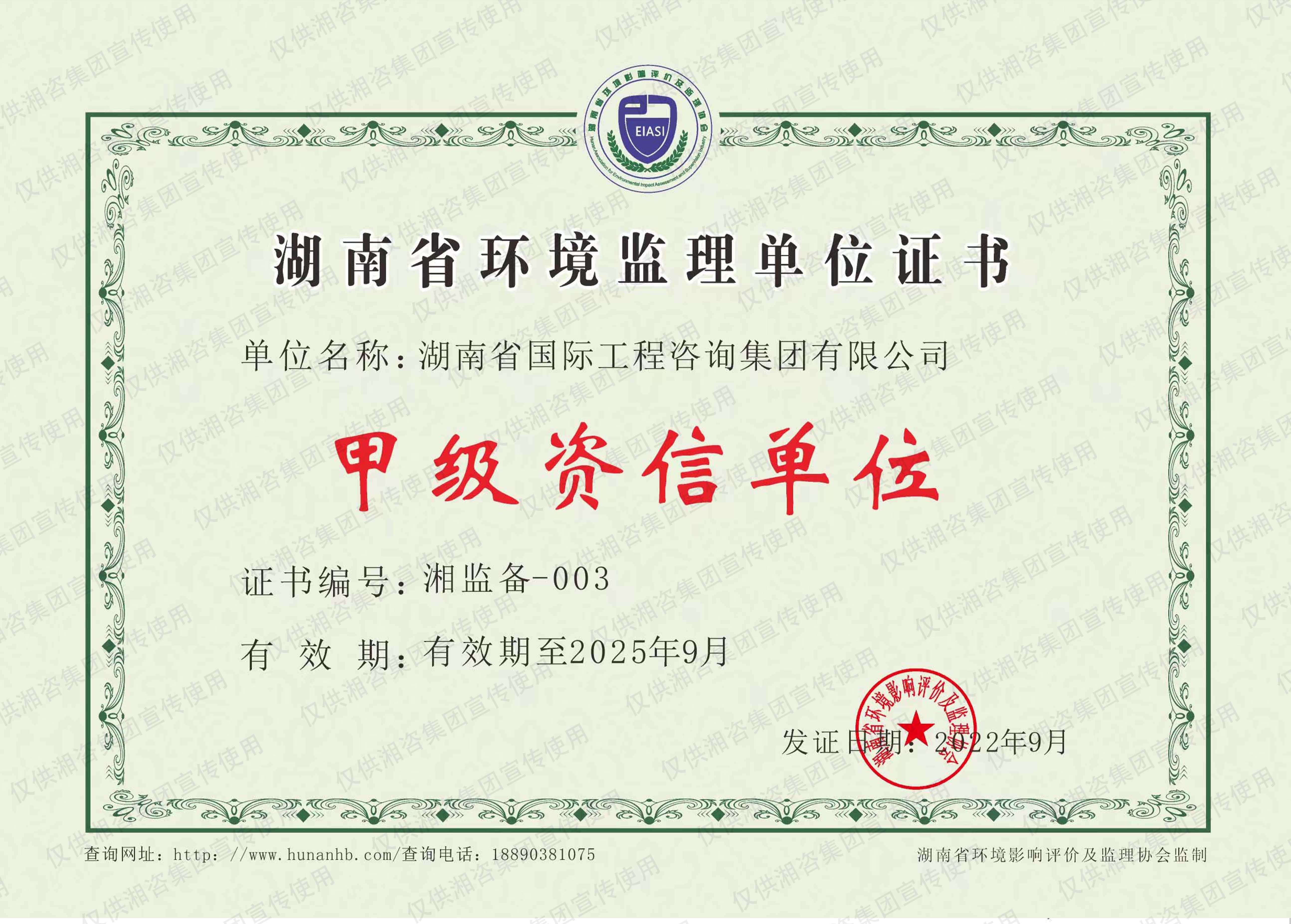 湖南省環(huán)境監(jiān)理證書(甲級資信單位)