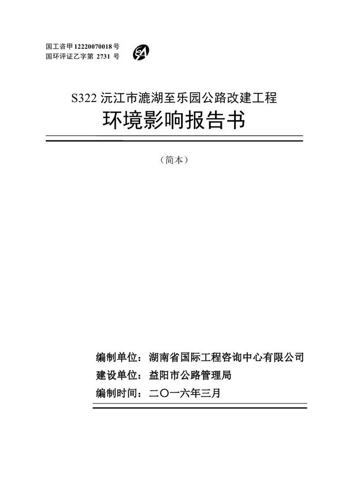 S322沅江市漉湖至樂(lè)園公路改建工程環(huán)境影響報(bào)告書(shū)(簡(jiǎn)本)