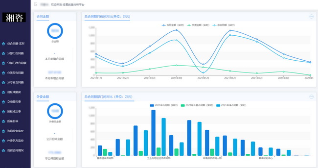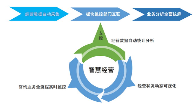 平臺以“智慧經(jīng)營”為主線,集經(jīng)營數(shù)據(jù)自動統(tǒng)計分析、咨詢業(yè)務全流程實時監(jiān)控、經(jīng)營狀況動態(tài)可視化于一體,支撐公司實現(xiàn)經(jīng)營數(shù)據(jù)自動采集、板塊監(jiān)控部門互聯(lián)、業(yè)務分析全面統(tǒng)籌等目標。平臺將匯聚各類型經(jīng)營數(shù)據(jù),按照12個維度來統(tǒng)計分析、直觀展示業(yè)務經(jīng)營情況,對數(shù)據(jù)逐步細化、深入分析,并為科學預判未來生產(chǎn)經(jīng)營走勢提供了可靠依據(jù)。
