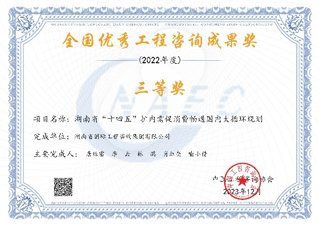 近日,中國工程咨詢協(xié)會公布了2022年度全國優(yōu)秀工程咨詢成果獎獲獎項目名單,由湘咨集團編制的三項成果榮獲全國優(yōu)秀工程咨詢成果獎三等獎。據(jù)悉,湖南省此次共有7家咨詢機構計12項成果獲獎,湘咨集團獲獎數(shù)量占總獲獎數(shù)的四分之一。