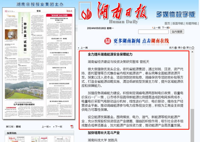 為順利實(shí)現(xiàn)“三高四新”美好藍(lán)圖,加快推進(jìn)高質(zhì)量發(fā)展,湖南省委決定在全省開展解放思想大討論活動(dòng),發(fā)起“獻(xiàn)策湖南”金點(diǎn)子征集活動(dòng)。湘咨集團(tuán)作為省級(jí)“智囊團(tuán)”積極響應(yīng),撰寫的《全力提升湖南能源安全保障能力》于3月18日被湖南日?qǐng)?bào)摘登發(fā)表。