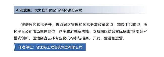 《大力推行園區(qū)市場(chǎng)化建設(shè)運(yùn)營(yíng)金點(diǎn)子》中建議,推進(jìn)園區(qū)管運(yùn)分開(kāi),選取園區(qū)管理和運(yùn)營(yíng)分離改革試點(diǎn);加快平臺(tái)轉(zhuǎn)型,強(qiáng)化平臺(tái)公司市場(chǎng)主體地位,剝離政府融資功能;支持園區(qū)結(jié)合實(shí)際探索“管委會(huì)+”模式創(chuàng)新,因地制宜選擇專(zhuān)業(yè)化機(jī)構(gòu)參與招商、開(kāi)發(fā)、建設(shè)和運(yùn)營(yíng)。