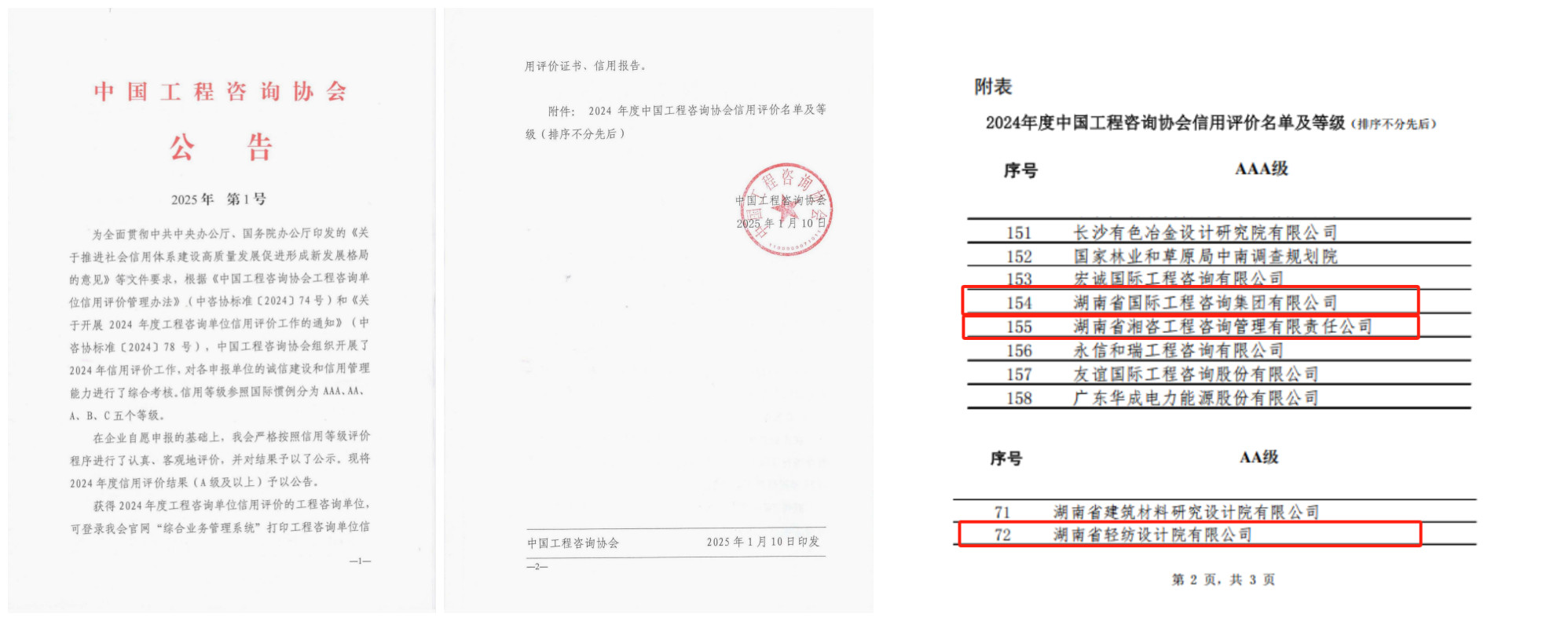 2025年1月10日,中國(guó)工程咨詢協(xié)會(huì)(下稱“中咨協(xié)”)發(fā)布2025年第1號(hào)公告,湘咨集團(tuán)成功獲評(píng)2024年工程咨詢單位信用評(píng)價(jià)等級(jí)AAA級(jí)。據(jù)省咨詢協(xié)會(huì)統(tǒng)計(jì),······